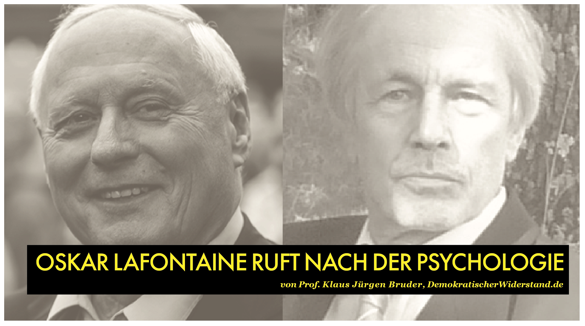 Dies ist ein Originalbeitrag für die Online-Ausgabe der Wochenzeitung Demokratischer Widerstand (DW). – Spenden, Abonnieren, Verteilen. – Prof. Klaus-Jürgen Bruder ist einer der angesehensten und meistgelesenen Psychologieprofessoren in der BRD der Gegenwart und der zurückliegenden Jahrzehnte. Er gilt zudem als einer der vielen »heimlichen« DW-Herausgeber. Zuletzt gab er das Buch »Militarisierung der Gesellschaft. Von der Glückssüchtigkeit zur Kriegsbereitschaft« heraus (Promedia, Wien 2025). Im Verlagshaus Sodenkamp & Lenz Berlin erschien »Corona – Inszenierung einer Krise«. | Bild/Grafik: DW-Grafik mit Bildmaterial von xtranews (CC; Lafontaine; l.)) und Psychozial-Verlag (Bruder, r.)